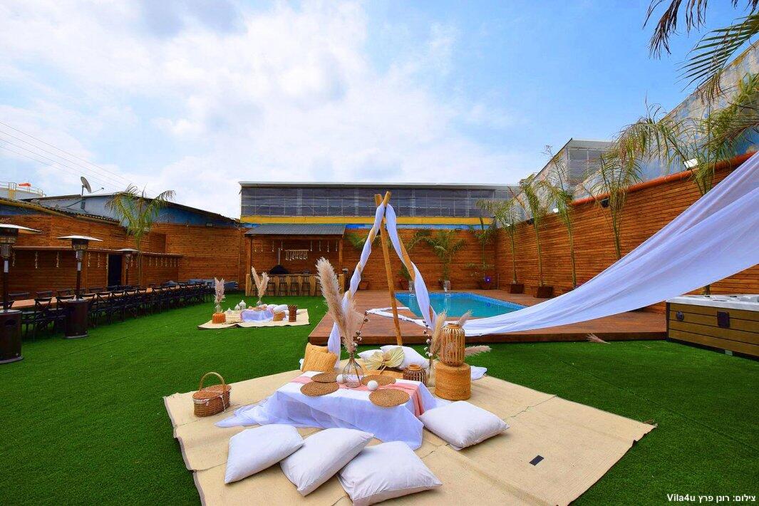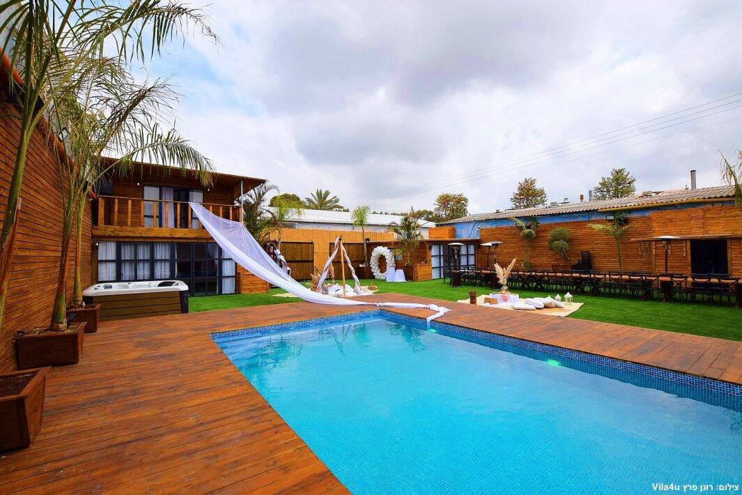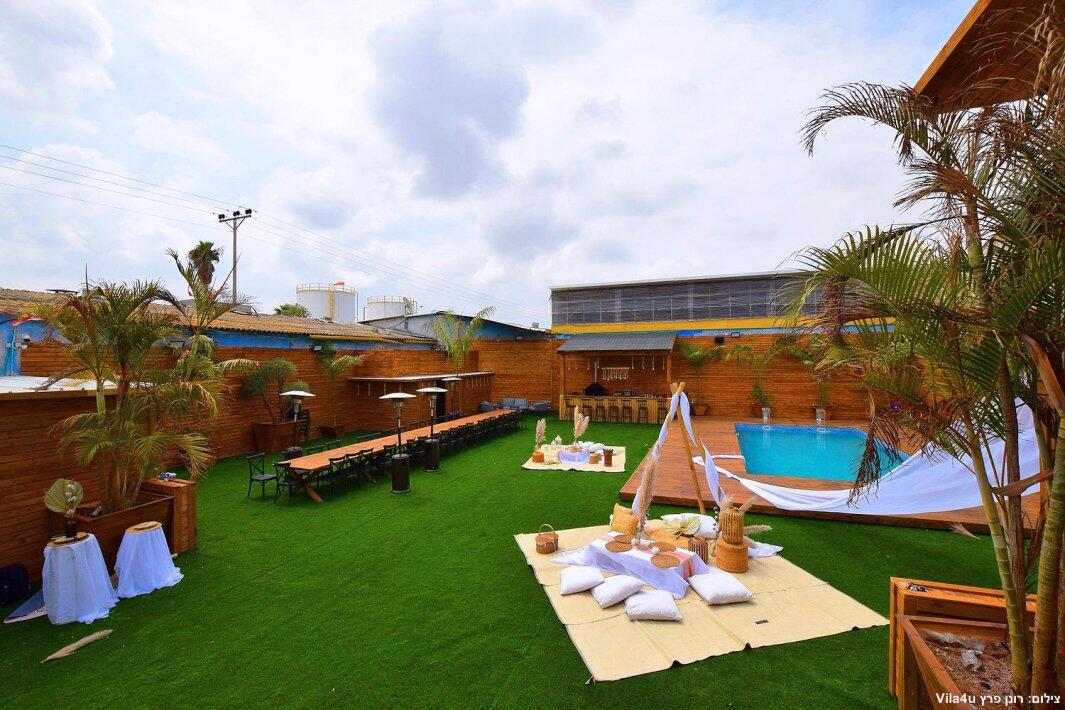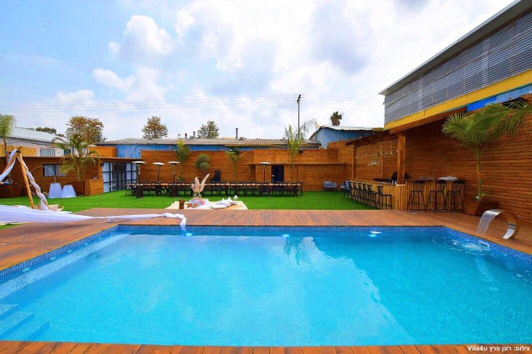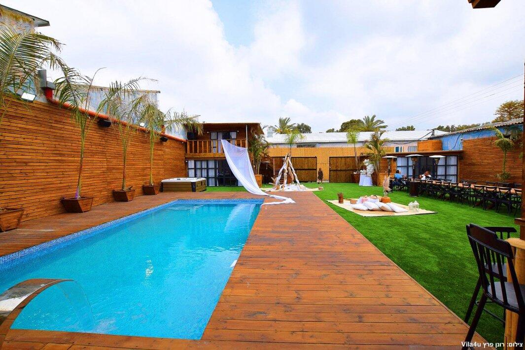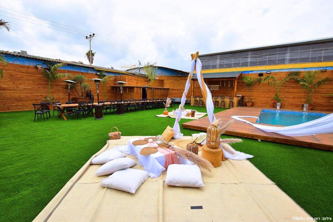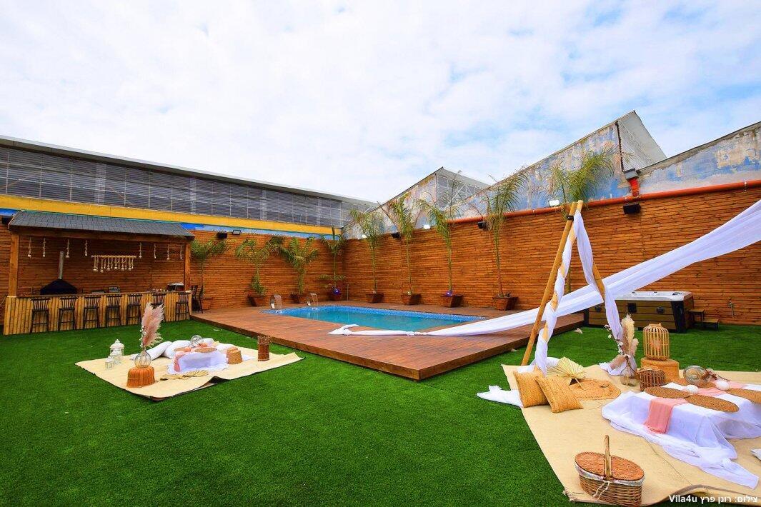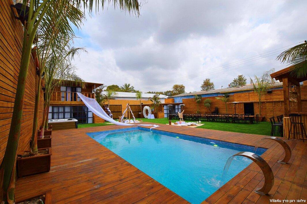 המתחם כולל חצר ענקית עם מדשאות רחבות וירוקות, בריכת שחייה מעוטרת עם מפלי מים, ג'קוזי ספא מפנק ובר ישיבה חיצוני. תיהנו מפינת ברביקיו, ריהוט גן איכותי, תאורה קסומה ומערכת שמע משוכללת. לנוחיותכם, שתי סוויטות מפוארות להתארגנות ביום האירוע.