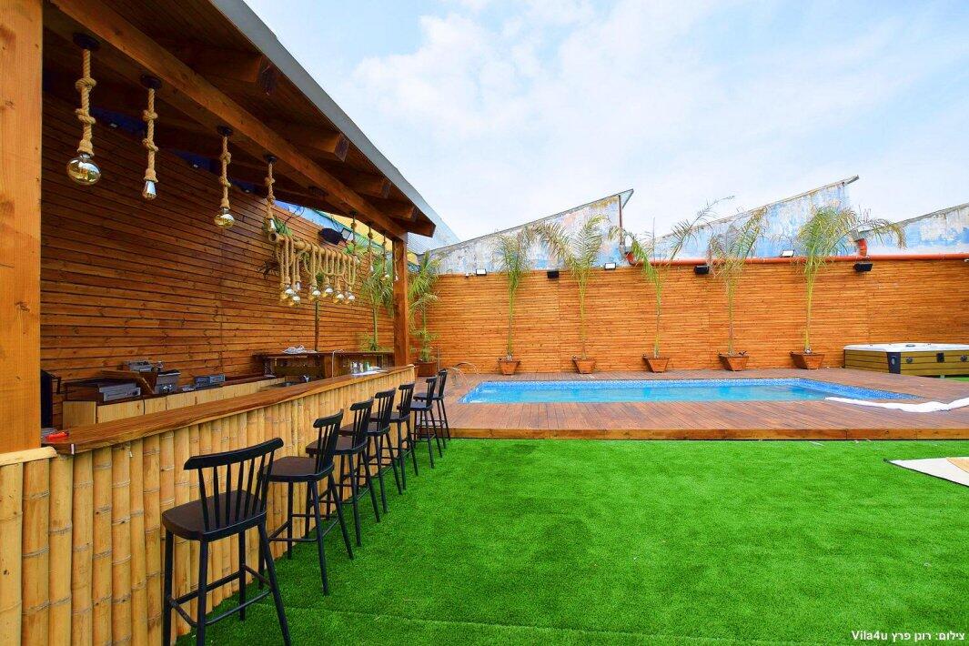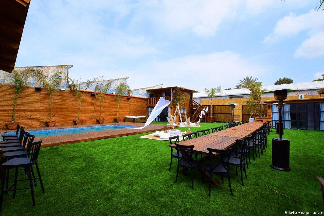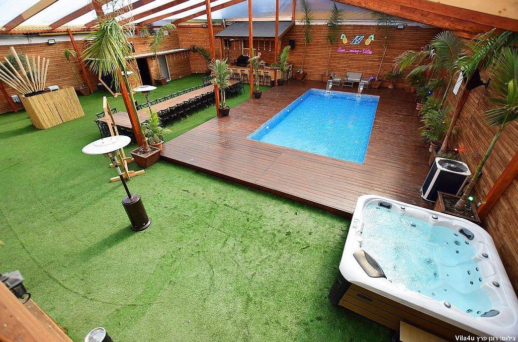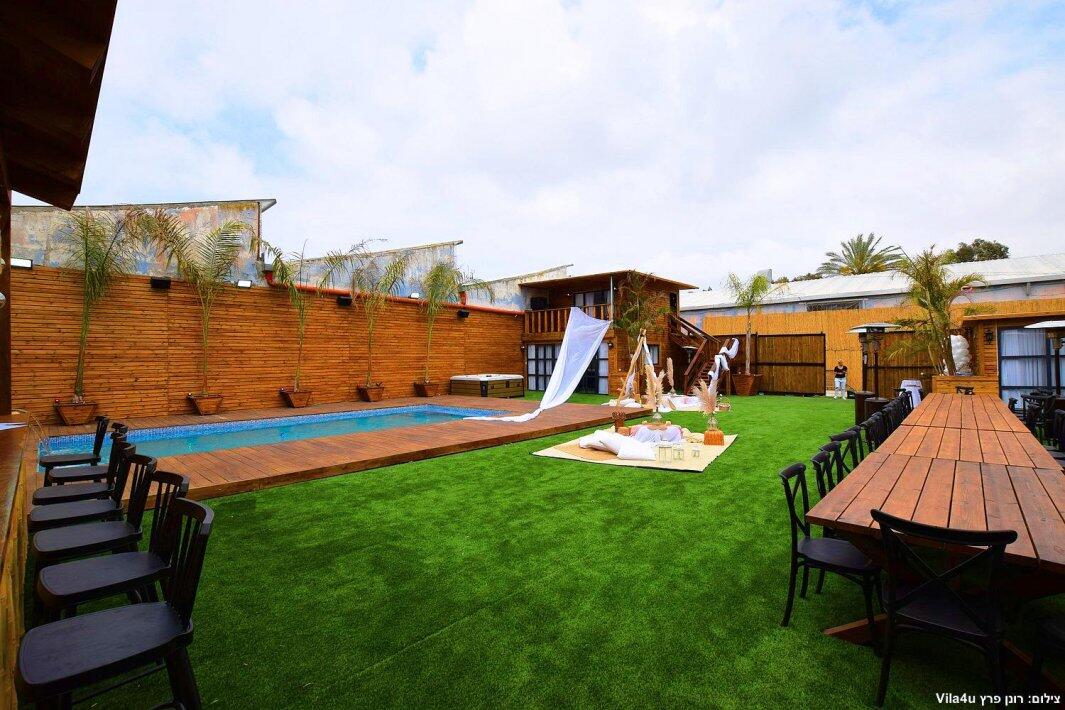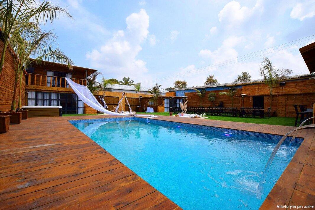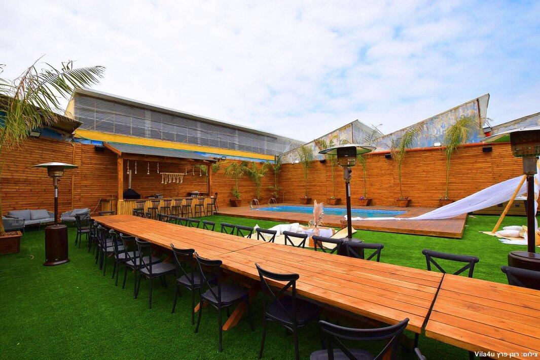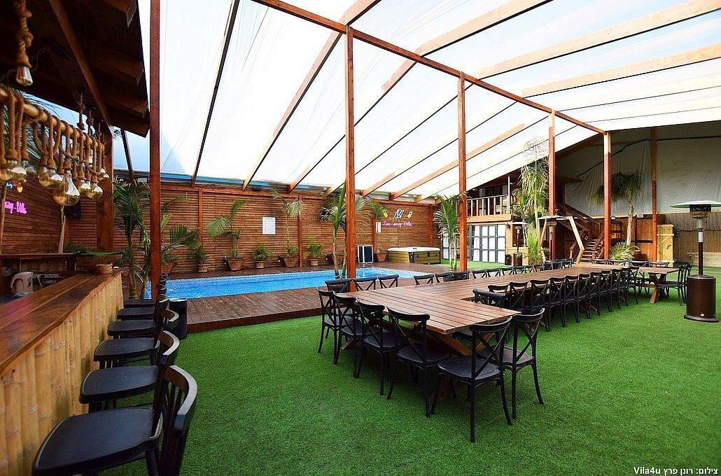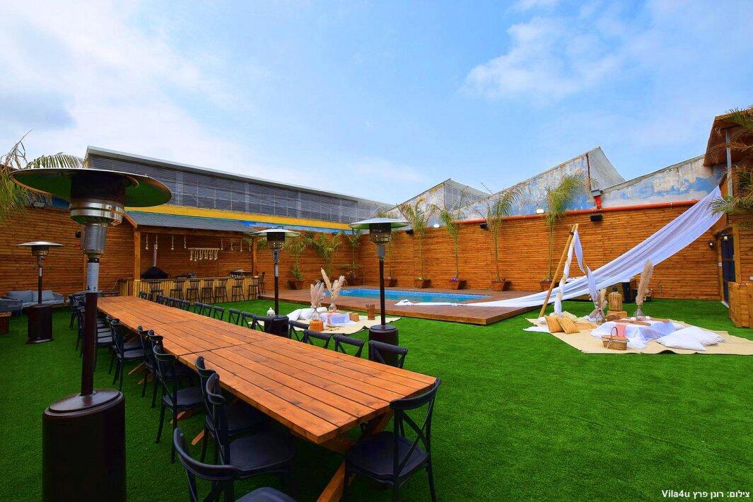 המתחם כולל חצר ענקית עם מדשאות רחבות וירוקות, בריכת שחייה מעוטרת עם מפלי מים, ג'קוזי ספא מפנק ובר ישיבה חיצוני. תיהנו מפינת ברביקיו, ריהוט גן איכותי, תאורה קסומה ומערכת שמע משוכללת. לנוחיותכם, שתי סוויטות מפוארות להתארגנות ביום האירוע.
