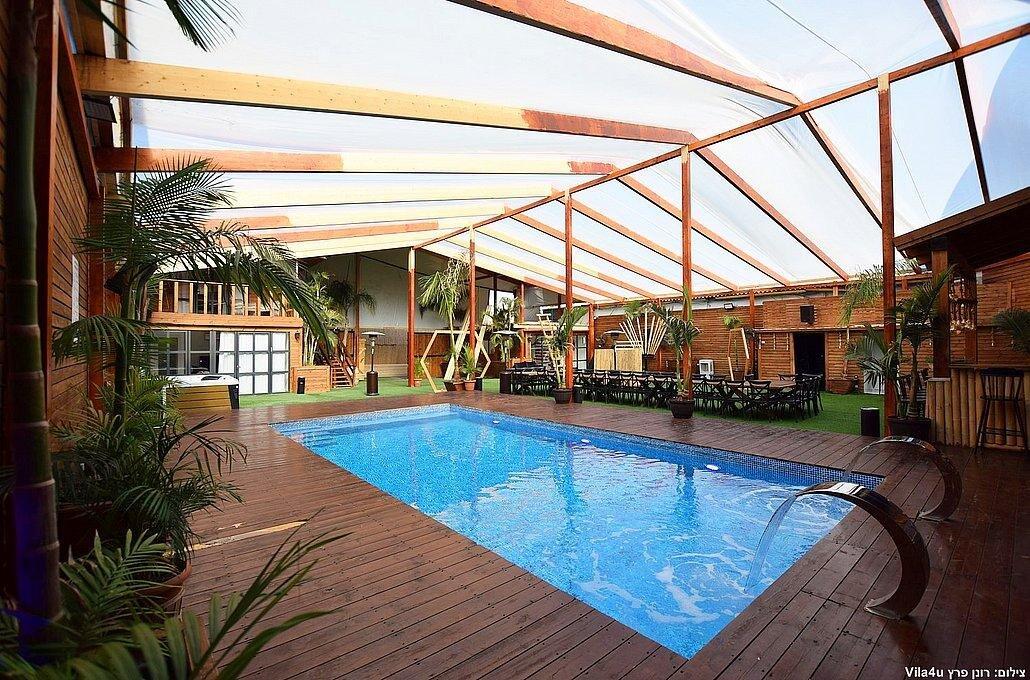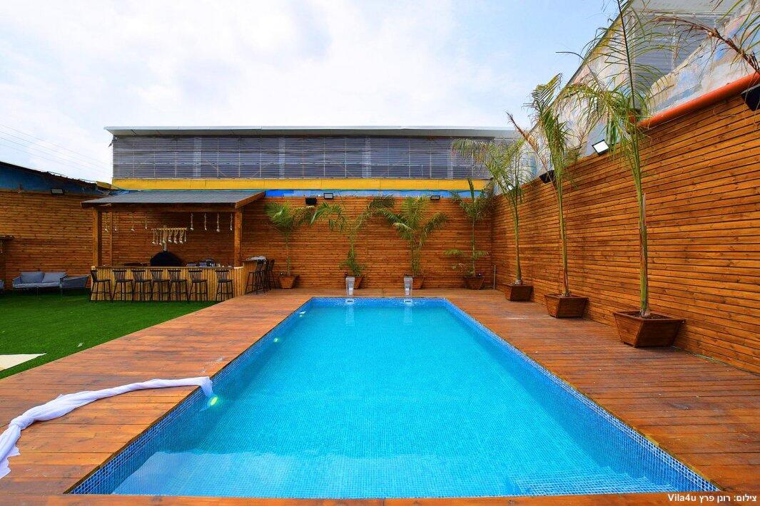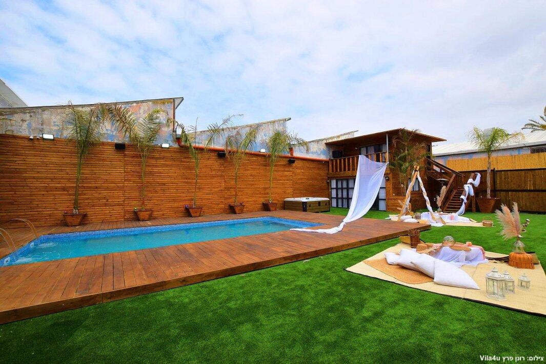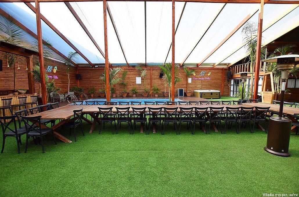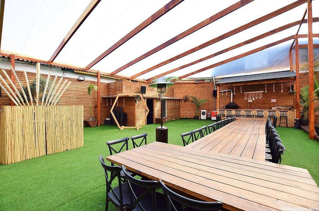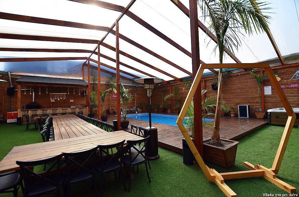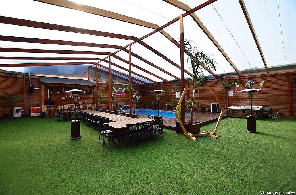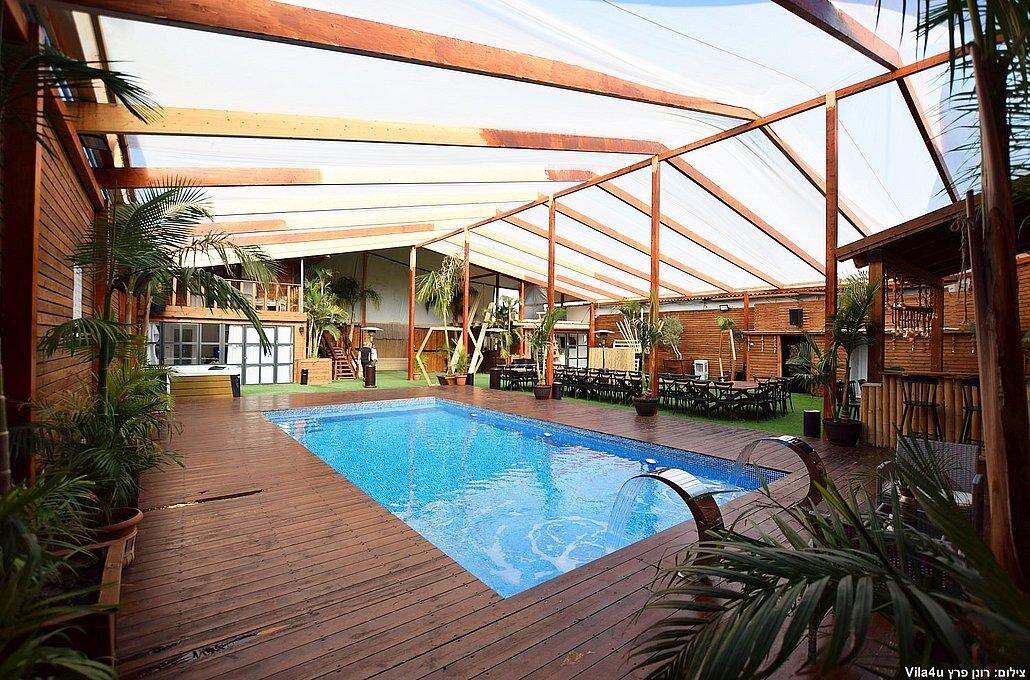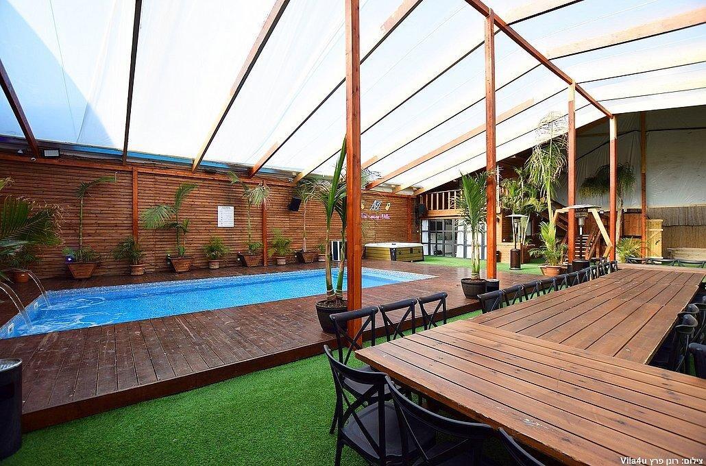 המתחם כולל חצר ענקית עם מדשאות רחבות וירוקות, בריכת שחייה מעוטרת עם מפלי מים, ג'קוזי ספא מפנק ובר ישיבה חיצוני. תיהנו מפינת ברביקיו, ריהוט גן איכותי, תאורה קסומה ומערכת שמע משוכללת. לנוחיותכם, שתי סוויטות מפוארות להתארגנות ביום האירוע.
