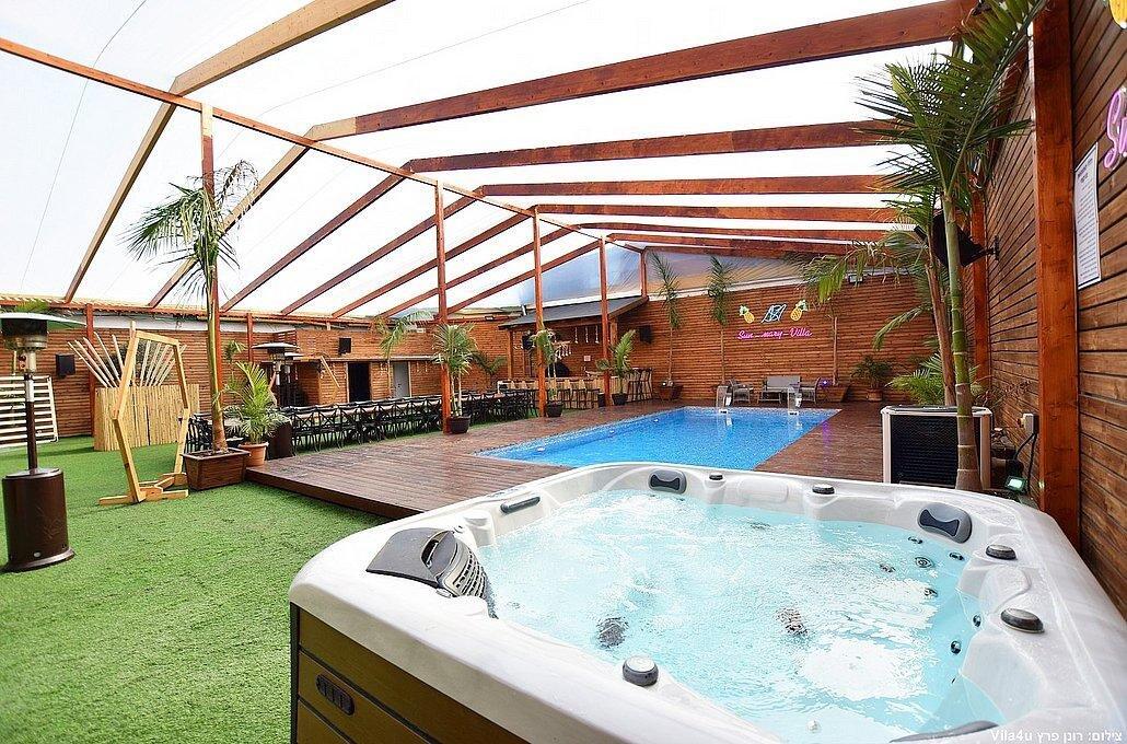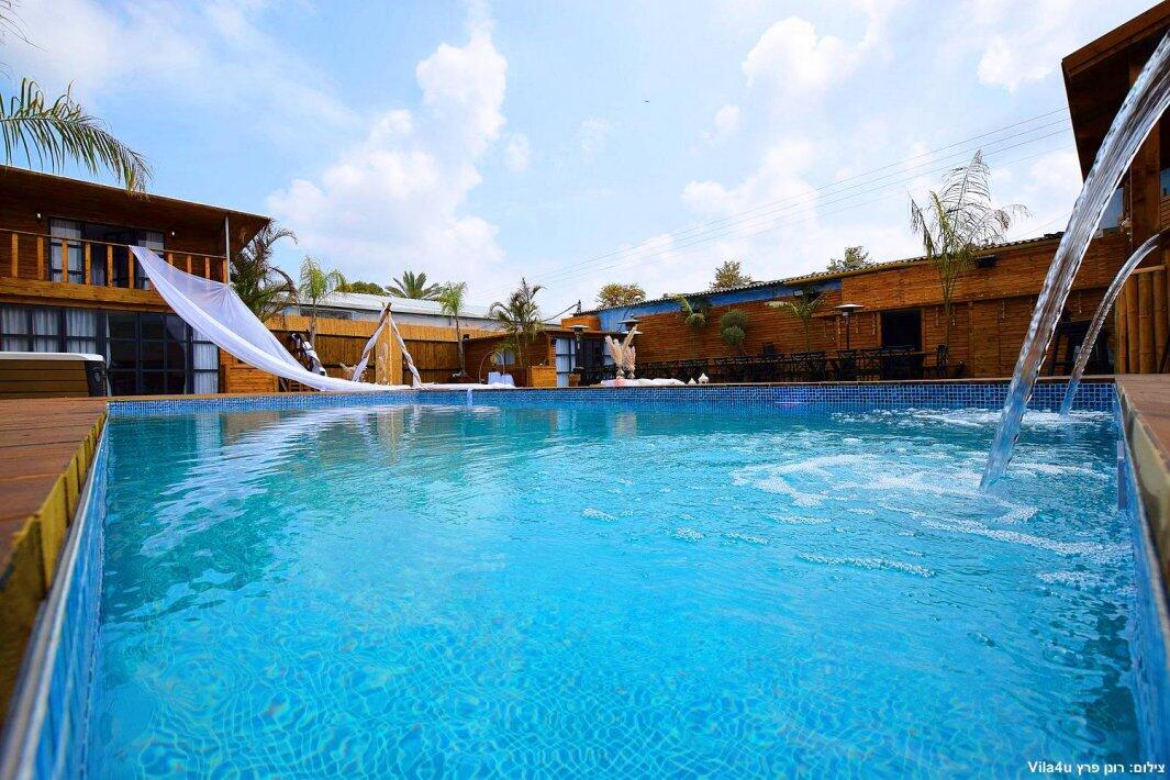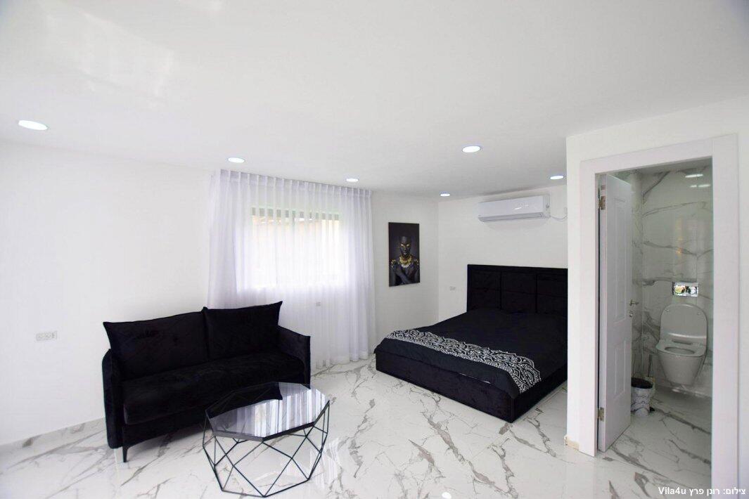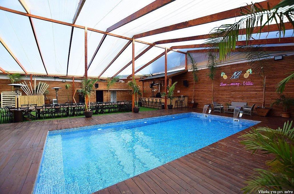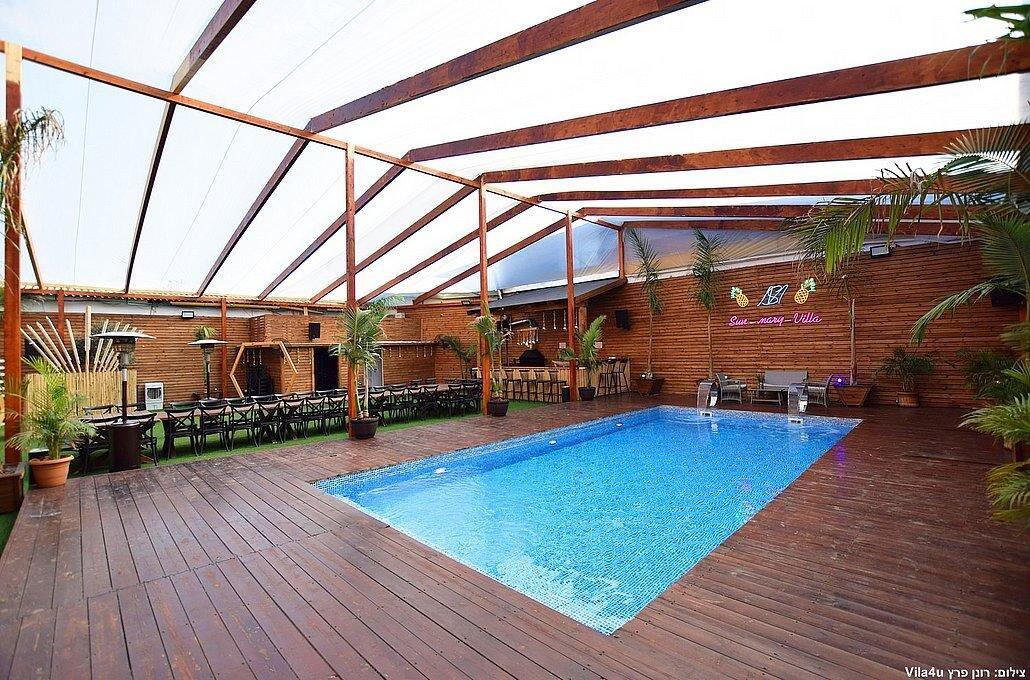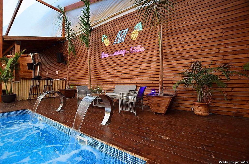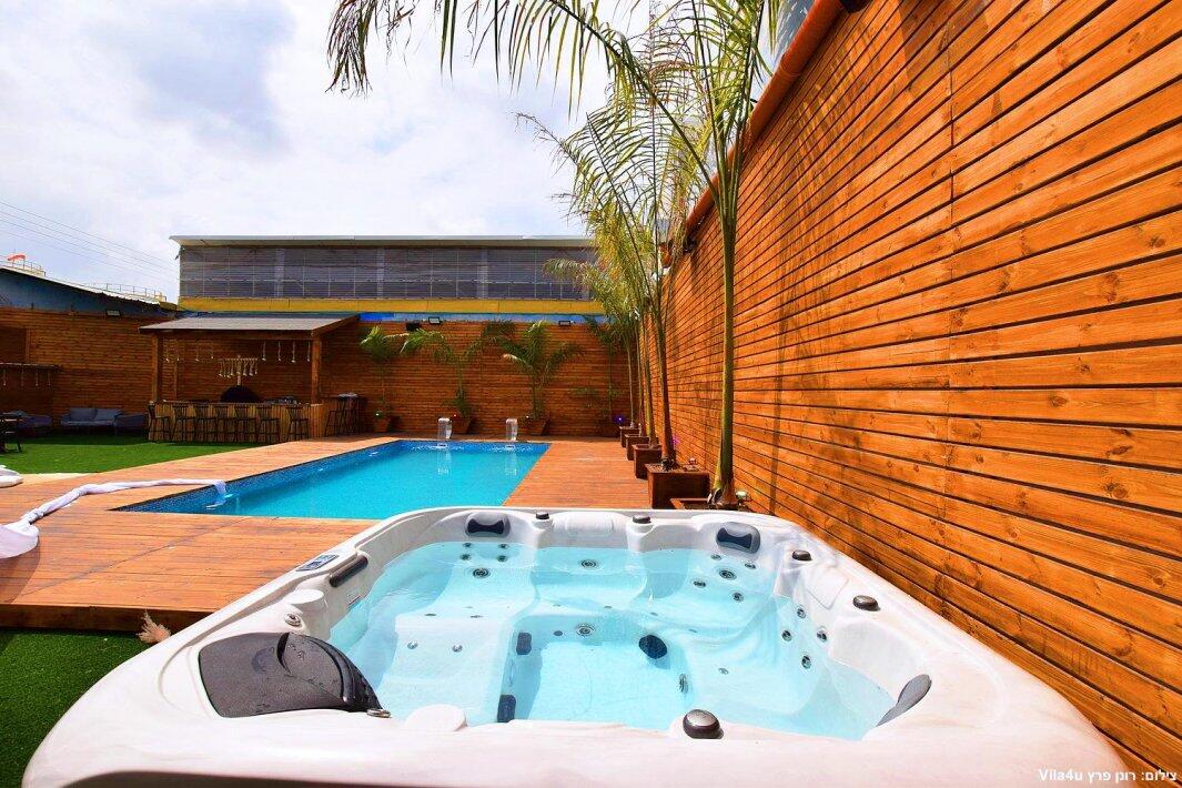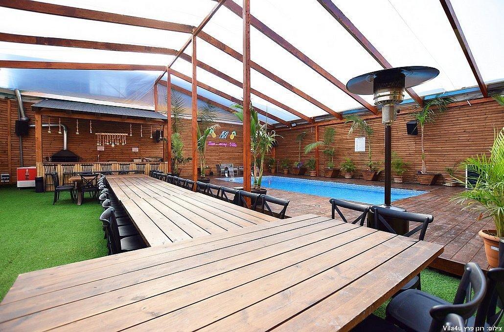 המתחם כולל חצר ענקית עם מדשאות רחבות וירוקות, בריכת שחייה מעוטרת עם מפלי מים, ג'קוזי ספא מפנק ובר ישיבה חיצוני. תיהנו מפינת ברביקיו, ריהוט גן איכותי, תאורה קסומה ומערכת שמע משוכללת. לנוחיותכם, שתי סוויטות מפוארות להתארגנות ביום האירוע.