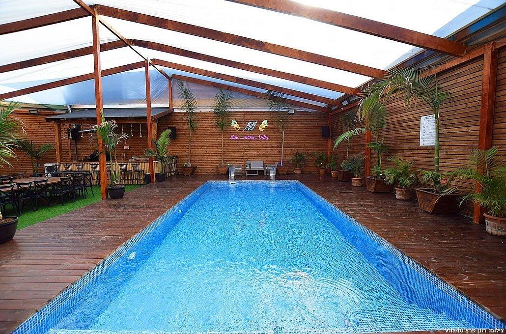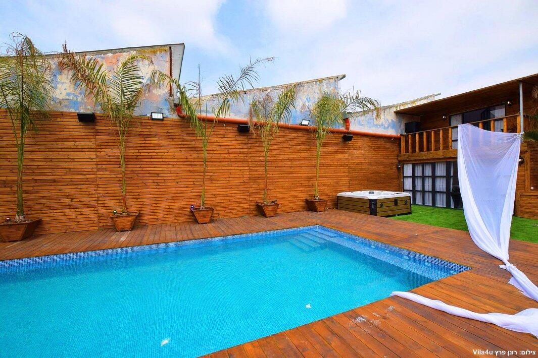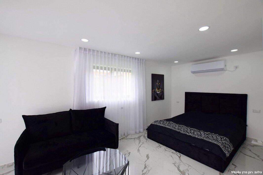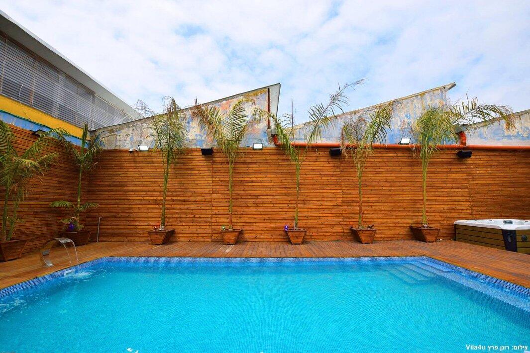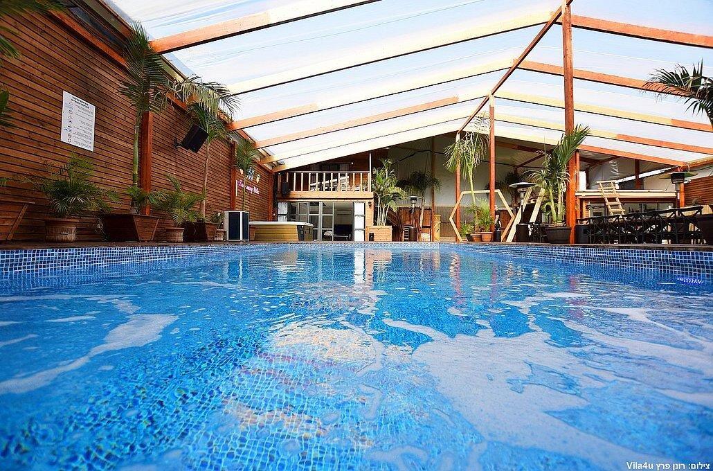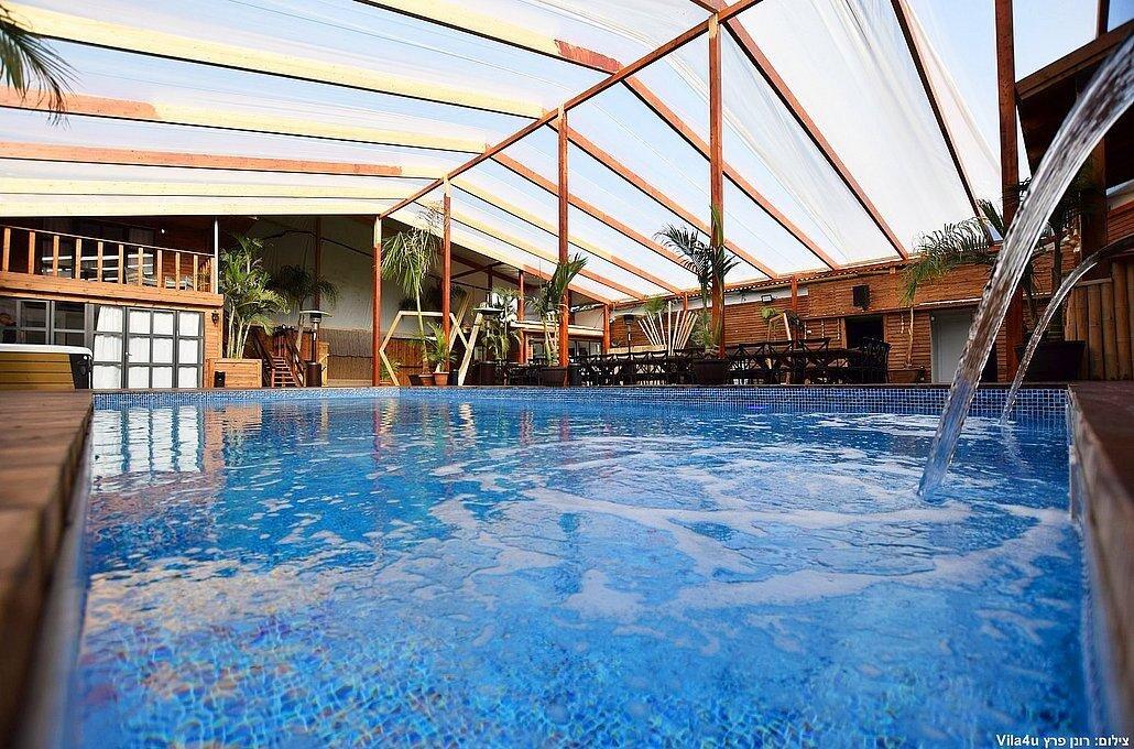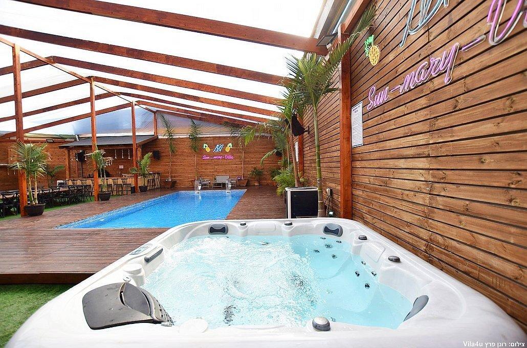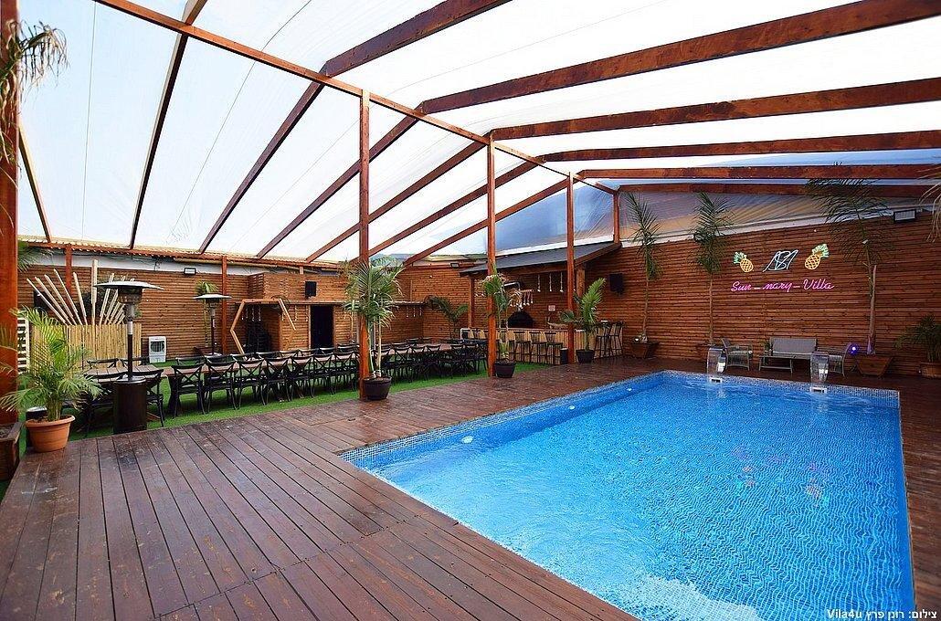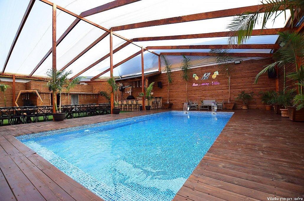 המתחם כולל חצר ענקית עם מדשאות רחבות וירוקות, בריכת שחייה מעוטרת עם מפלי מים, ג'קוזי ספא מפנק ובר ישיבה חיצוני. תיהנו מפינת ברביקיו, ריהוט גן איכותי, תאורה קסומה ומערכת שמע משוכללת. לנוחיותכם, שתי סוויטות מפוארות להתארגנות ביום האירוע.