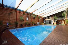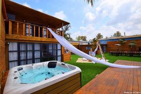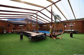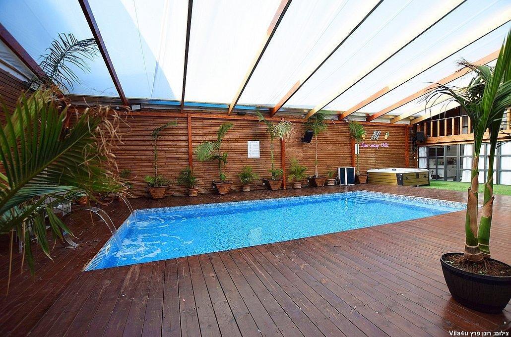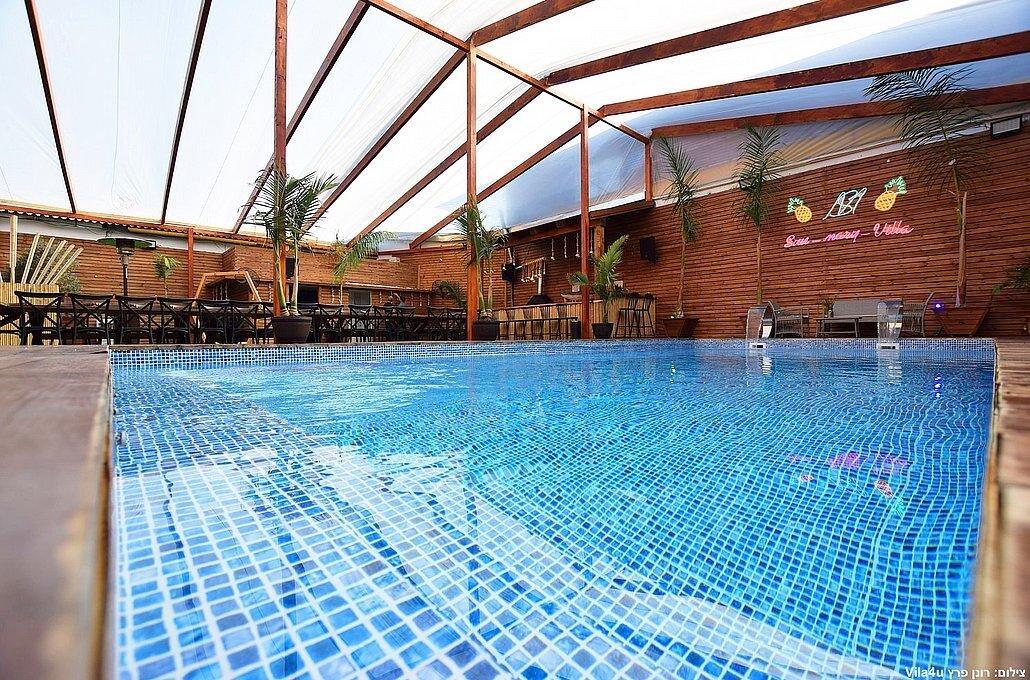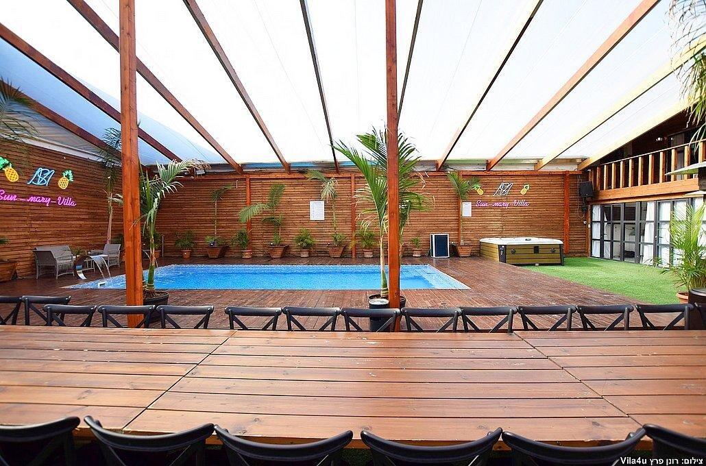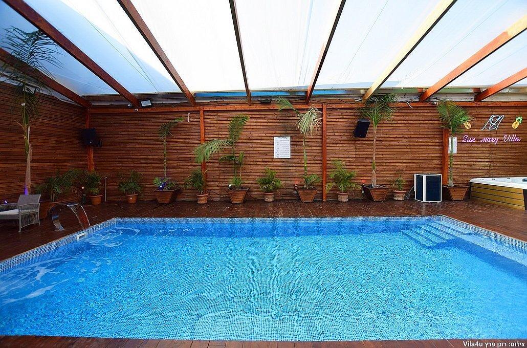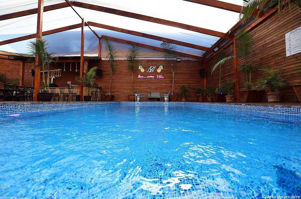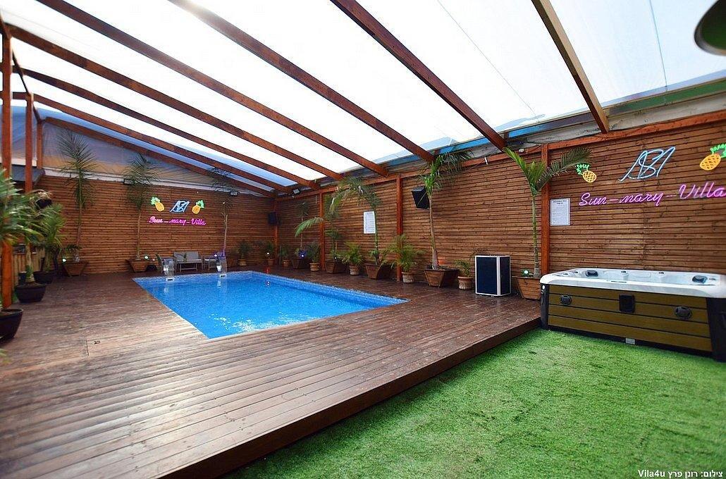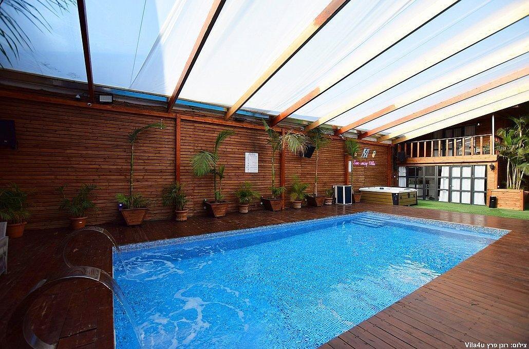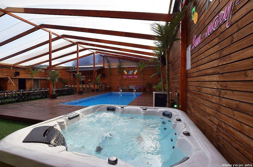 המתחם כולל חצר ענקית עם מדשאות רחבות וירוקות, בריכת שחייה מעוטרת עם מפלי מים, ג'קוזי ספא מפנק ובר ישיבה חיצוני. תיהנו מפינת ברביקיו, ריהוט גן איכותי, תאורה קסומה ומערכת שמע משוכללת. לנוחיותכם, שתי סוויטות מפוארות להתארגנות ביום האירוע.